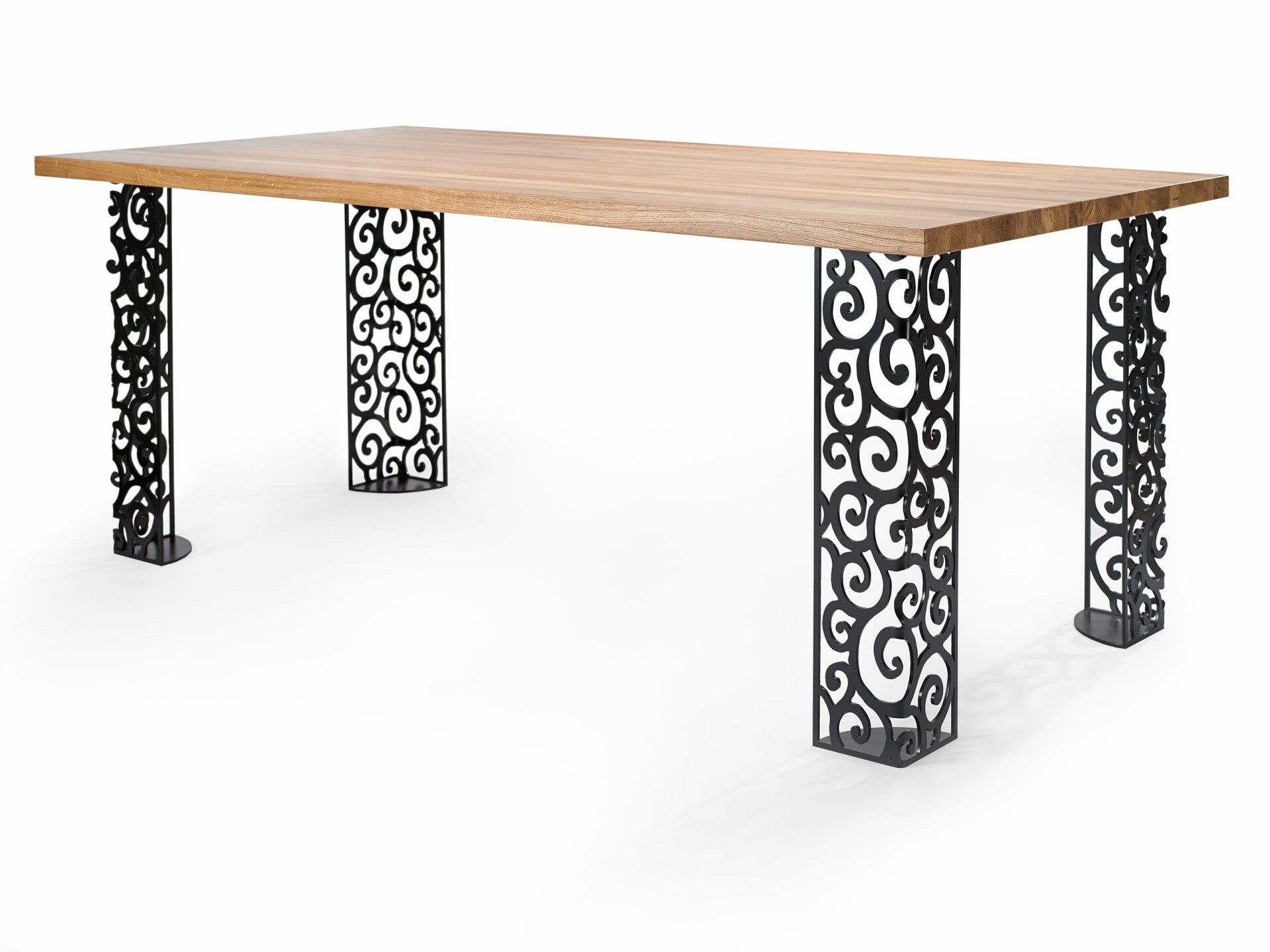 Deze luxe en exclusieve eettafel van eikenhout is een combinatie van hoogwaardig eikenhout en staal. Afgeronde R3-randen beschermen de hoeken van het tafelblad tegen beschadigingen. De poten van de eettafel hebben een opengewerkte structuur van staal en zijn behandeld met een zwarte RAL 9005 poedercoating ter berscherming en behoud van de kwaliteit. Dankzij het originele ontwerp is de eettafel zeer stabiel. Door de zorgvuldige afwerking is dit unieke meubelstuk een mooie investering wat jarenlang meegaat.