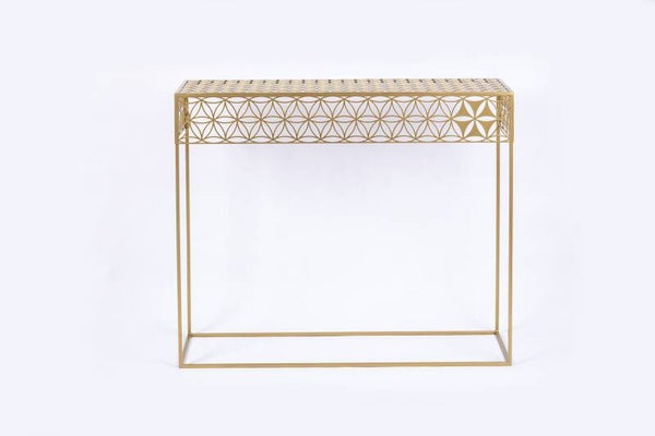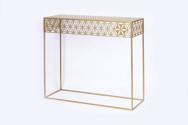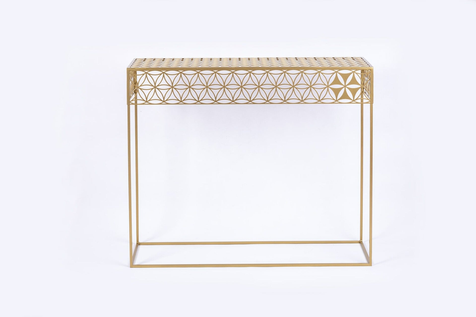 De Flower of Life bijzettafel is een combinatie van rijke symboliek met een bijzonder en uniek design. Het symbool van de Flower of Life bijzettafel, de rode draad van dit exclusieve meubelstuk, is gemaakt in de oudheid. Een prachtige gouden coating met glitterdeeltjes, die het staal bedekt, reflecteert subtiel het licht en verlicht het interieur. De geavanceerde technologie van lasersnijden maakte het mogelijk om dergelijke complexe vormen te verkrijgen. De stijlvolle Flower of Life consoletafel is de perfecte keuze voor alle liefhebbers van luxe artikelen in een originele uitvoering.