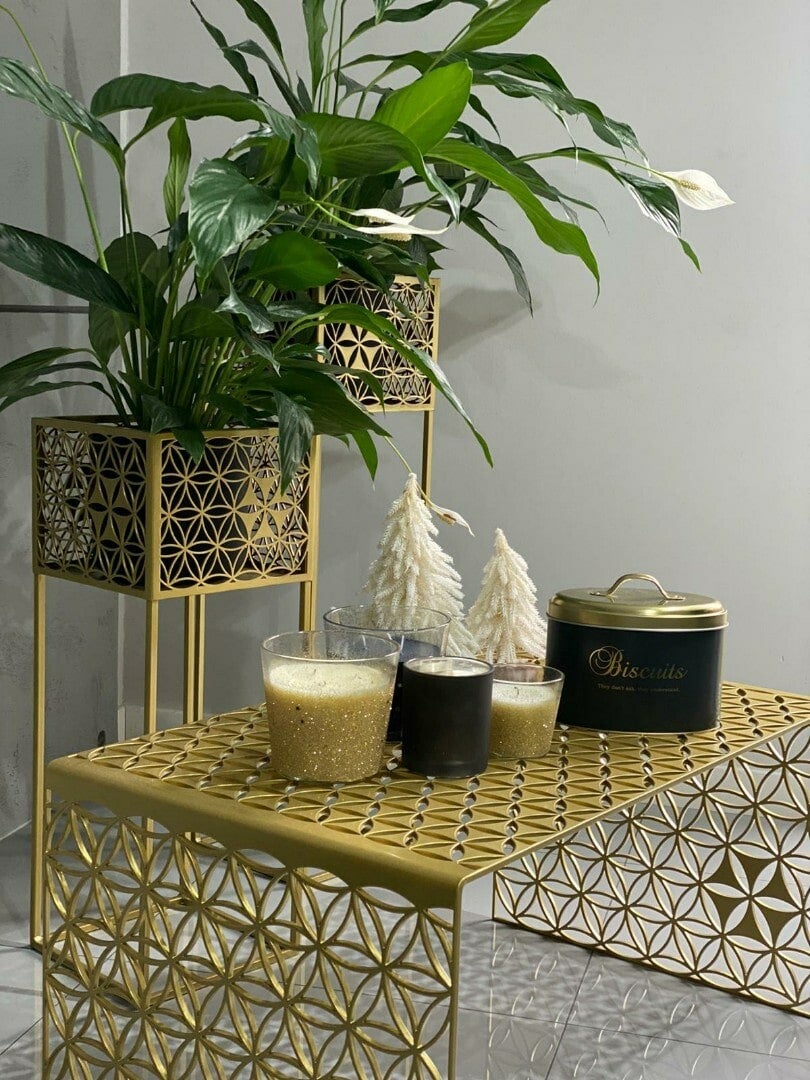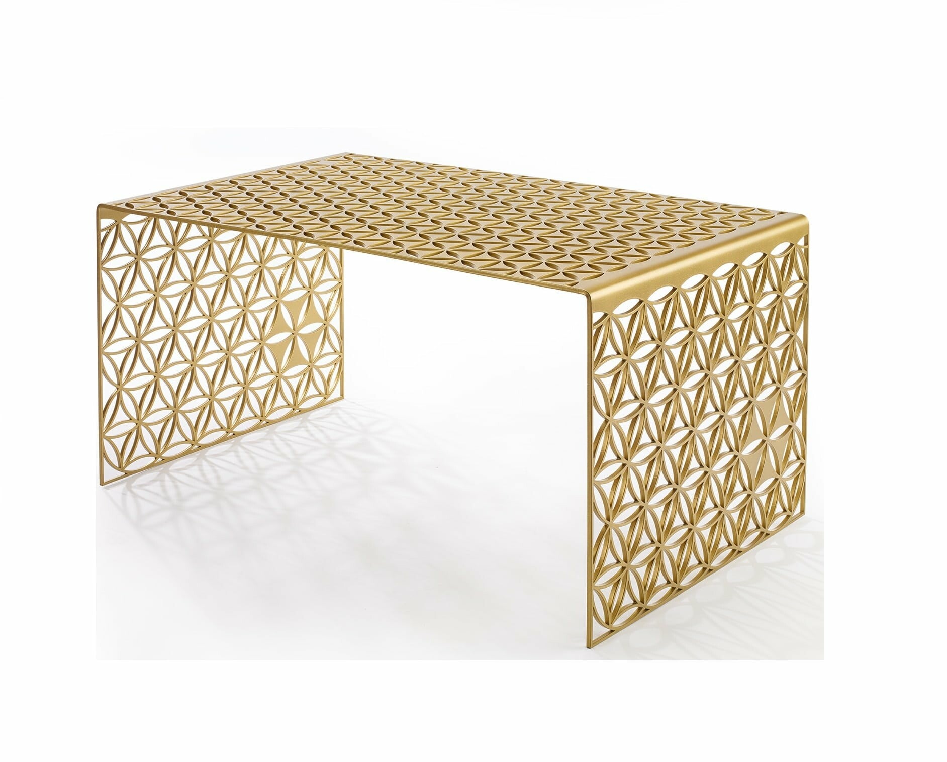 De Flower of Life consoletafel is een combinatie van rijke symboliek met een bijzonder en uniek design. Het symbool van de Flower of Life bijzettafel, de rode draad van dit exclusieve meubelstuk, is gemaakt in de oudheid. Een prachtige gouden coating met glitterdeeltjes, die het staal bedekt, reflecteert subtiel het licht en verlicht het interieur. De geavanceerde technologie van lasersnijden maakte het mogelijk om dergelijke complexe vormen te verkrijgen. De stijlvolle Flower of Life bijzettafel is de perfecte keuze voor alle liefhebbers van luxe artikelen in een originele uitvoering.